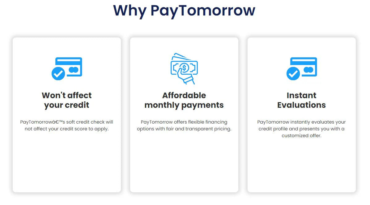 We provide easy and affordable financing through our partner PayTomorrow, so you can buy today and PayTomorrow!