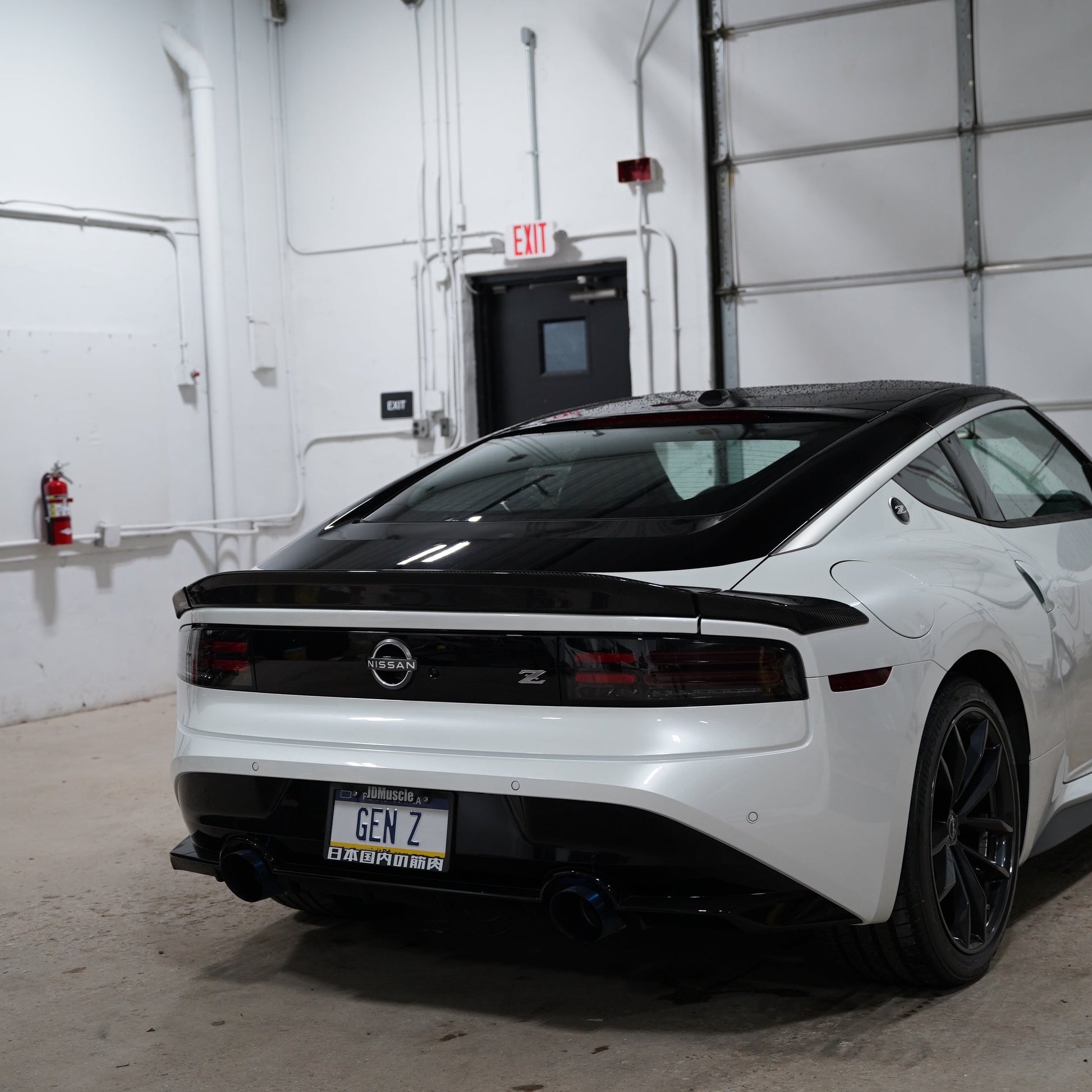 JDMuscle offers a Carbon Fiber Duckbill Spoiler specifically designed for the 2023-2024 Nissan Z. This spoiler provides a bold and distinctive look, transforming the vehicle's rear profile. It's meticulously crafted and available in both vacuum-fused and dry carbon fiber variants, ensuring a unique blend of style and aerodynamic performance.