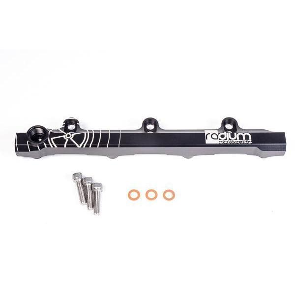 Radium Fuel Rail Kits are CNC machined from solid 6061 aluminum and black dipped anodized for a high quality surface finish. It is compatible with all fuel types including popular alcohol mixtures such as E85.